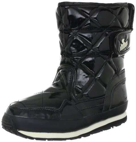 Blk shiny quilted snowjogger boot with faux fur lining, adjustable velcro tab and signature 'RD' Silver Logo. With shock-absorbing Flex Foam mid sole and a rubber tread out sole for great traction in the snow. A molded internal heel provides a snug fit, support and comfort while a new internal water-resistant membrane helps keep feet dry.